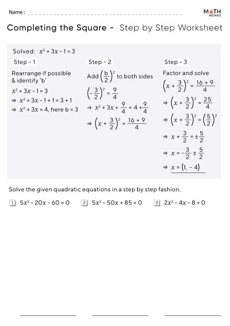 Completing The Square Worksheet Pdf. The equation x2 + 4x + 9 can be written in the form (x + a)2 + b. 1) a2 + 2a − 3 = 0 {1, −3} 2) a2 − 2a − 8 = 0 {4, −2} 3) p2 + 16 p −.